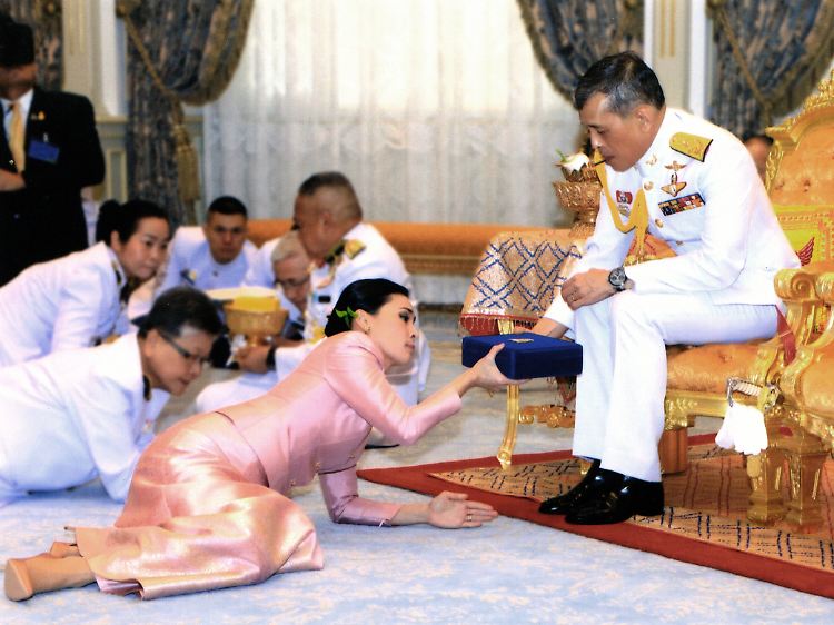 Es ist ein bizarrer Anblick: Bei einer Zeremonie liegt eine Frau dem thailändischen König Rama X. wortwörtlich zu Füßen. Die 33 Jahre jüngere Sineenat ist seine Geliebte - die der verheiratete Monarch nun zu seiner Ersatzfrau erklärt.
