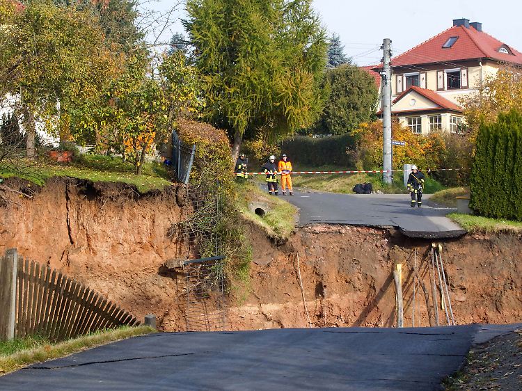 Der Schrecken kommt in der Nacht: Anwohner hören ein Rasseln und ein lautes, strömendes Geräusch, als ob mehrere Schotterlaster ihre Ladung abkippen. "Wir wurden zu einem Loch in der Straße mit Wasserrohrbruch gerufen. Mit solch einem Ausmaß hat keiner gerechnet", sagt Marco Gröger von der Freiwilligen Feuerwehr. Er blickt auf ein riesiges Erdloch, das sich am frühen Montagmorgen in einer Wohnsiedlung im thüringischen Schmalkalden aufgetan hat. Und das Loch wächst: Stetig bricht der Krater an den Rändern nach, durchziehen immer neue Risse Straße und Hauswände. "Wir wissen nicht, wann ein Ende abzusehen ist", sorgt sich der Feuerwehrmann.