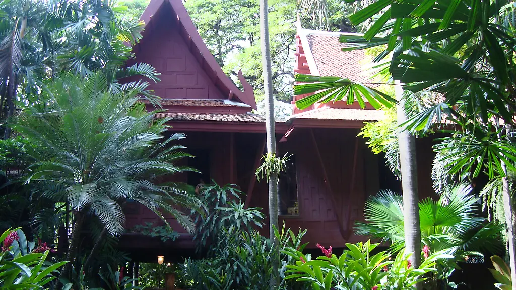 Im Restaurant der Anlage mundet frischer Mangosaft. Das Auge erfreut sich an der Blütenpracht, einem Teich mit Fischen und Skulpturen. In großen Schalen schwimmen Lotusblüten. Der hölzerne Gebäudekomplex trägt rote Außenfarbe, die von einem traditionellen Konservierungsmittel stammt. In Ayutthaya, der alten Hauptstadt Thailands, wurden die Dachschindeln gebrannt. Von hier stammt auch ein Teil der heute wohl 250 Jahre alten Hausteile, die Thompson auseinandernehmen, nach Bangkok transportieren und hier wieder zusammenfügen ließ.
