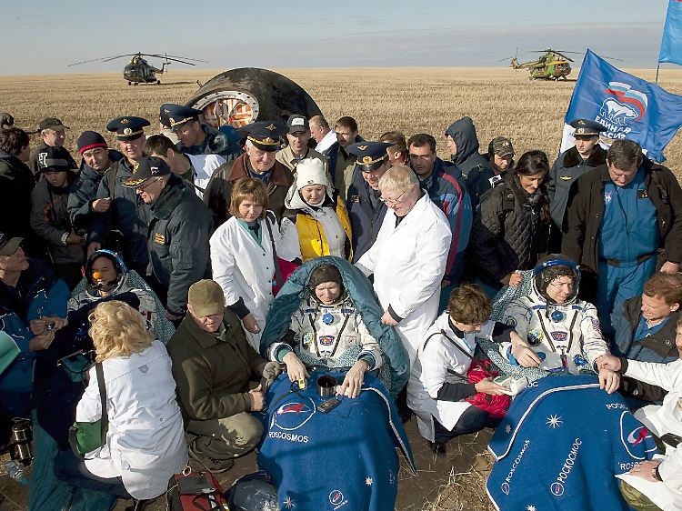 Mit Laliberté kehrten auch der Kosmonaut Gennadi Padalka und der Astronaut Michael Barrett zurück, die insgesamt gut ein halbes Jahr - 198 Tage - im Weltraum gewesen waren. "Start und Landung verliefen nach Plan. Das Befinden der Raumfahrer ist normal", sagte ein Sprecher der Zentrale bei Moskau der Agentur Interfax zufolge. Die Sojus-Kapsel landete bei etwa sieben Grad Celsius Bodentemperatur in der Nähe der zentralasiatischen Stadt Arkalyk. Der Rückflug in dem engen Raumapparat dauerte etwa dreieinhalb Stunden.