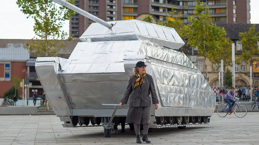 In Mannheim steht ein Holzpanzer. Passanten sollen nachdenken und staunen. Nachdenken über den Abzug der US-Soldaten und die brachliegenden Militärflächen, staunen über das, was aus einem Panzer werden kann.