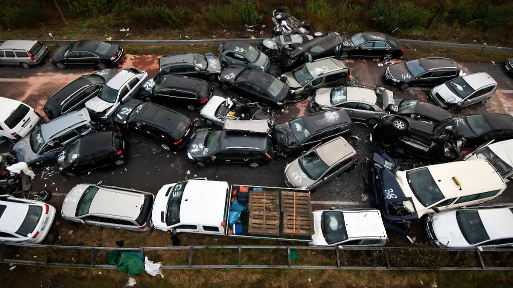 Bei Tageslicht waren die ineinander verkeilten Autos, aufgeschweißte Wracks, Sachverständige mit Kameras und Kranwagen zu sehen. Die Unfallstelle erstreckte sich über mehrere hundert Meter. Auf der zweispurigen Autobahn standen stellenweise vier Wracks nebeneinander. Autodächer, die von den Rettern abgeschweißt worden waren, um eingeklemmte Opfer zu bergen, lagen auf anderen Wagen. Viele der Unfallautos trugen aufgesprühte Nummern, die den Hilfskräften und Ermittlern bei der Orientierung helfen sollten.