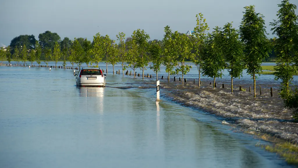 Nach dem Deichbruch bei Fischbeck überflutet das Hochwasser der Elbe die Straße B 188 zwischen Stendal (Sachsen-Anhalt) und Rathenow (Brandenburg). (Foto: dpa)