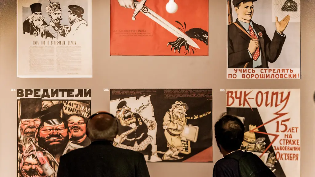 Visitors-look-soviet-propaganda-banners-of-30-s-in-a-exhibition-of-the-Gulag-History-Museum-in-Moscow-Russia-on-21-May-2018