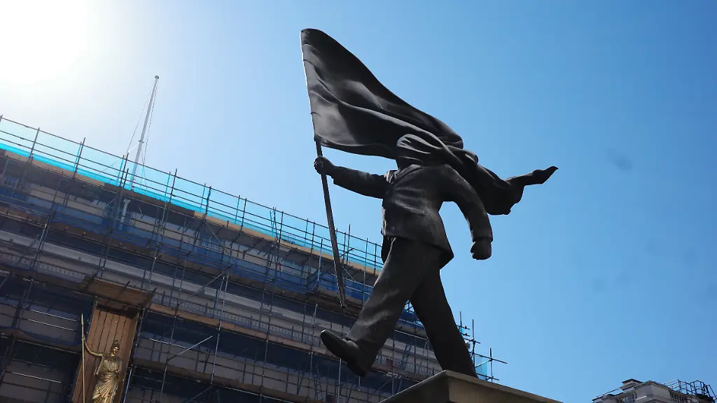 Eine plötzlich aufgetauchte Statue im Zentrum Londons hat für Aufregung in der Kunst- und Kulturwelt gesorgt. Die überlebensgroße Figur scheint von einem Podest in den Abgrund zu schreiten, sie trägt eine große Fahne, die ihr ins Gesicht weht. Als Signatur steht am Fuß des Sockels: Banksy. Der weltberühmte, mysteriöse Künstler veröffentlichte am Nachmittag ein Video, das zeigt, wie die Statue aufgestellt wird.