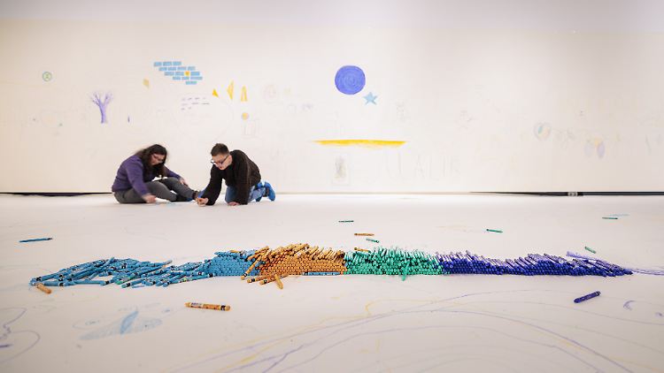 Angst, dass etwas kaputtgeht, hat sie nicht. Sie lässt sogar mit Naturfarben gefärbte Eiswürfel auf Leinwände legen. So entsteht ein Bild nach dem anderen. Noch mehr eigene Kreativität kurbelt ein mit Papier ausgekleideter Raum an: Jeder darf zum Stift greifen und das Kunstwerk vervollständigen. Mit ihrem Konzept geht die Museumschefin zurück in vordigitale Zeiten, kommt ganz ohne Bildschirme und Technikgadgets aus. Es soll entdeckt werden, wie der eigene Fantasiemuskel funktioniert.