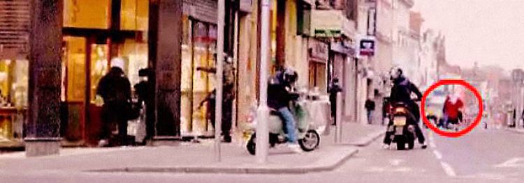 Angeblich sind die Aufnahmen jedoch von einem Passanten, der zufällig in der Nähe des Schmuckladens vorbeigekommen sein soll. Mit Integral-Helmen maskierte Räuber schlagen mitten am Tag mit Vorschlaghämmern die Schaufensterscheiben des Geschäfts im mittelenglischen Northampton ein. Plötzlich rennt eine rund 70-jährige Dame im roten Mantel, den Schal fest über ihre Haare gezogen, über die Straße auf die sechs Räuber zu, schwingt mit beiden Händen ihre große schwarze Handtasche und schlägt auf die überraschten Männer ein.