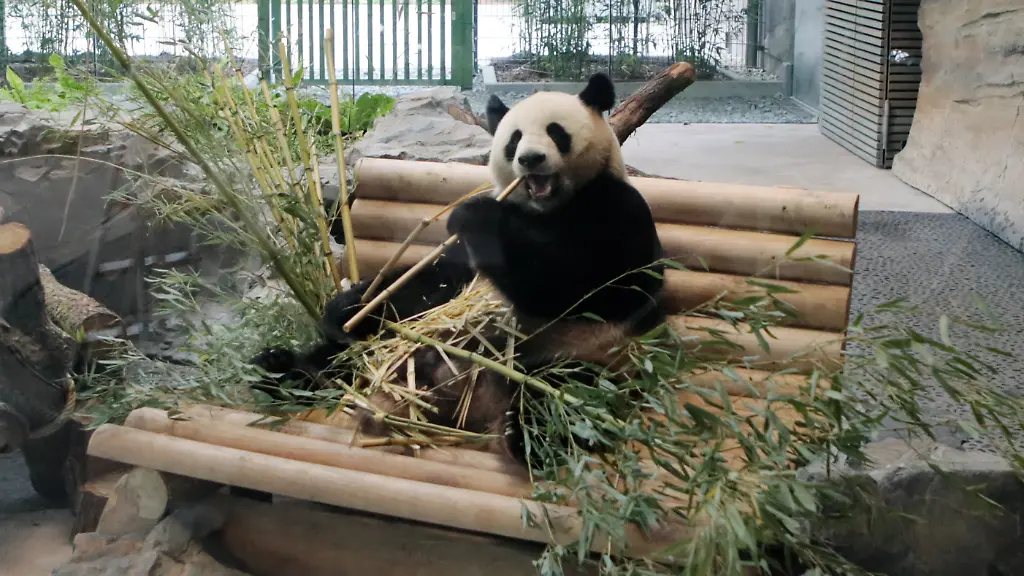 Wegen der starken Regenfälle der vergangenen Tage konnten Träumchen und Schätzchen die Außenanlage noch nicht in Ruhe erkunden. Anstatt unter freiem Himmel das Klettergerüst, die Schaukel und den felsigen Wasserlauf zu inspizieren, sitzt Träumchen nun mit etlichen Bambuszweigen im Schoß auf einer Bank im Innengehege. Seelenruhig verputzt das Panda-Weibchen eine Bambusstange nach der anderen. Auf der anderen Seite der Scheibe beobachten Merkel und Xi das Tier.