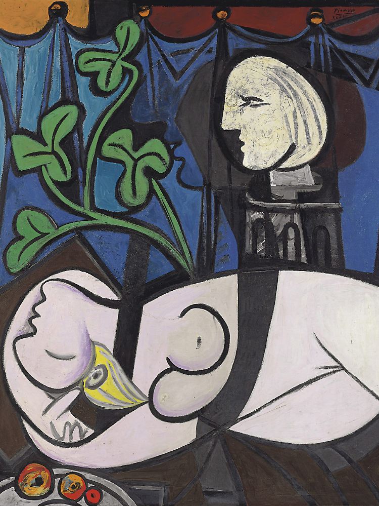 "Heute wurde auf dem Kunstmarkt Geschichte geschrieben", hieß es vom Auktionshaus. Wer sie schrieb, ist unbekannt, weil der Käufer per Telefon mitbot und anonym blieb. Das Bild, das ihm so viel Wert war, zeigt eine liegende Frau in einem Atelier vor einem blauen Vorhang. Prominent im Hintergrund sind eine Büste und ein Zweig mit grünen Blättern zu sehen, im Vordergrund eine Obstschale. Picasso hatte das Bild zum Ende seines "annus mirabilis" gemalt, seines "Wunderjahres" rund um seinen 50. Geburtstag, das zu den produktivsten seines 91-jährigen Lebens zählt.