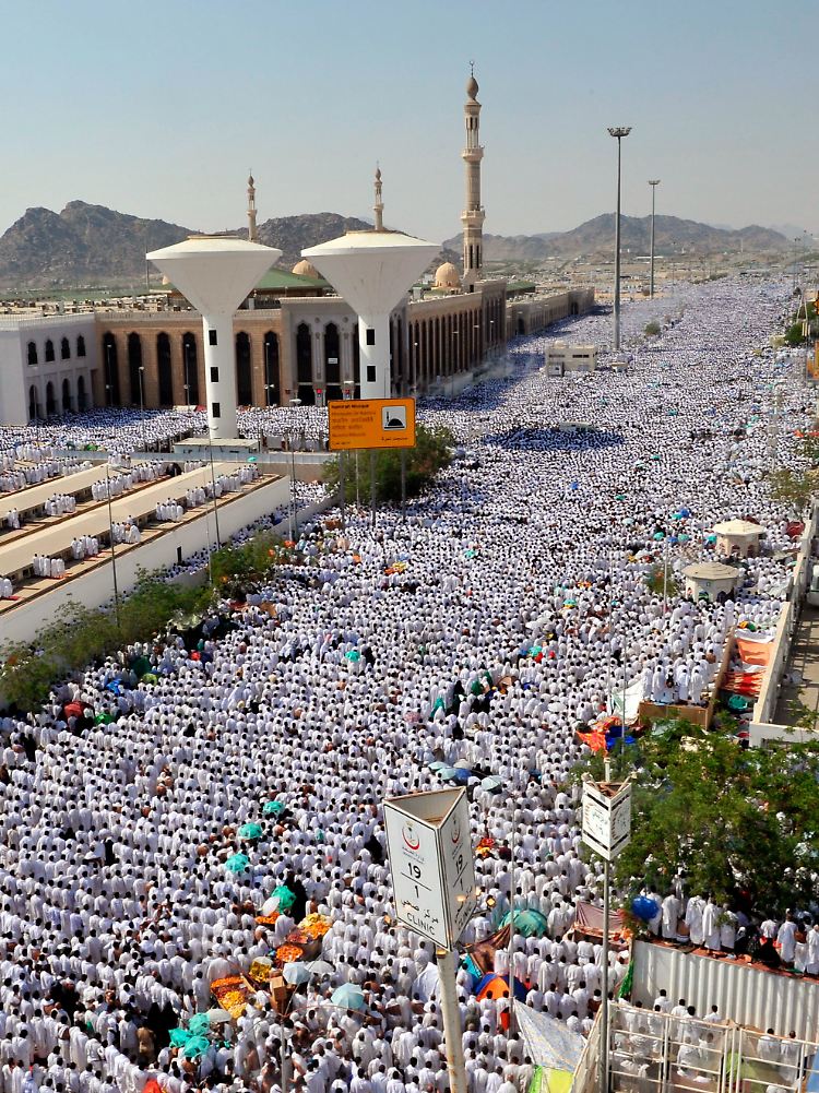 Zum Höhepunkt des Hadsch haben sich rund drei Millionen muslimische Pilger aus aller Welt auf dem Berg Arafat in Saudi-Arabien versammelt. Dort sprachen sie Gebete, baten Gott um Vergebung und meditierten. Nach der Besteigung des Berges stand auf dem Rückweg in das etwa 25 Kilometer entfernte Mekka die symbolische Steinigung des Teufels auf dem Programm. Die Pilger werfen dabei in der Stadt Mina Kieselsteine auf Steinsäulen, ehe sie zum Abschluss der großen jährlichen Pilgerfahrt den riesigen schwarzen Steinwürfel Kaaba im Hof der Großen Moschee im nahe gelegenen Mekka umkreisen.