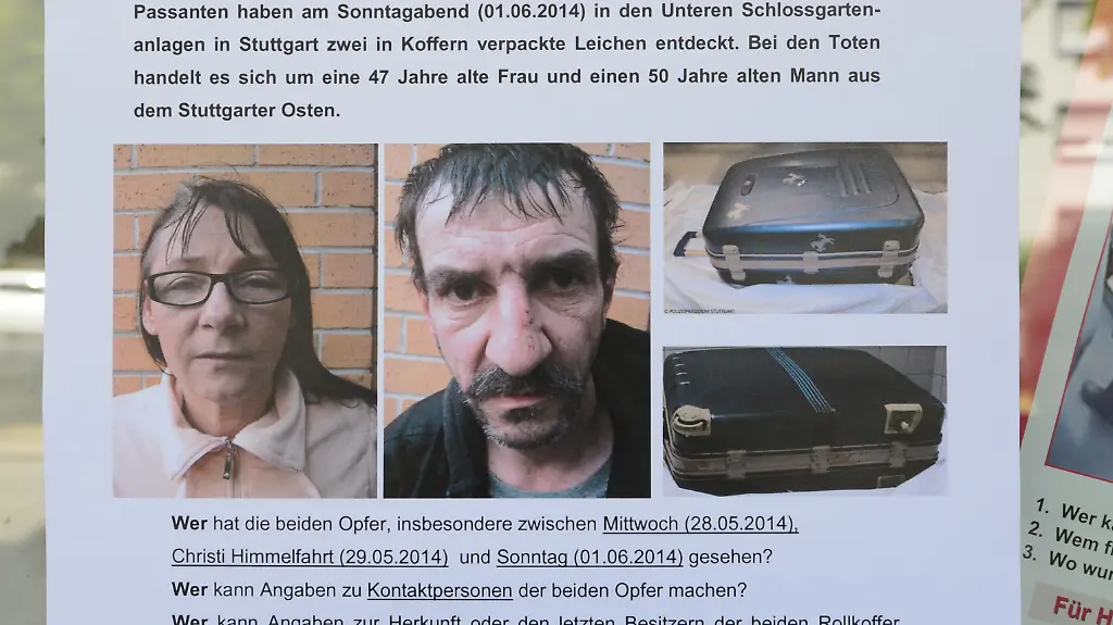 Im Fall der Stuttgarter Koffer-Leichen erhofft sich die Polizei mit der Veröffentlichung von Fotos der Opfer weitere Hinweise. Plakate mit vor dem Tod aufgenommenen Fotos des Mannes und der Frau sollen in Teilen der Stadt aufgehängt werden, teilte die Polizei mit.