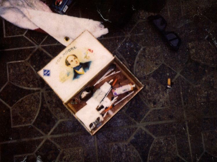 Die Utensilien eines Rockstars: Zigaretten, Feuerzeug, Sonnenbrille - und Fixerbesteck.