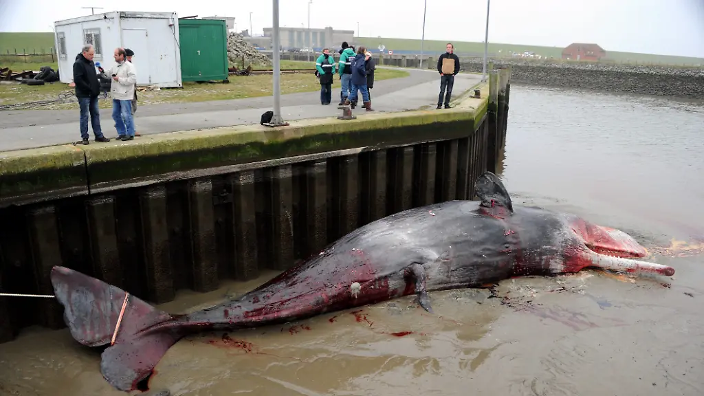 Ein 15 Meter langer Pottwal ist vor der Nordsee-Insel Pellworm gestrandet. Das Riesentier wurde in der Nacht zum Dienstag in den Meldorfer Hafen am Festland geschleppt. Dort soll der Kadaver an Land gezogen und in den nächsten Tagen zerlegt werden.