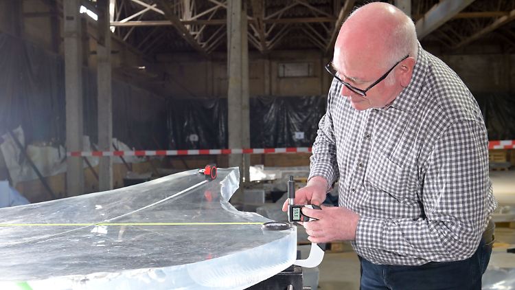 Dabei müsse man vorgehen wie ein Detektiv. In einem ersten Schritt wurde noch am Unfallort die genaue Position der Bruchstücke bestimmt und eine Karte erstellt. Das erleichtere die Rekonstruktion in der Lagerhalle. Dort wird der Zylinder seit einigen Wochen Stück für Stück wiederhergestellt. Allerdings nicht in dreidimensionaler Form, sondern auf dem Boden liegend, als würde man ihn ausrollen, erklärt Bonten.