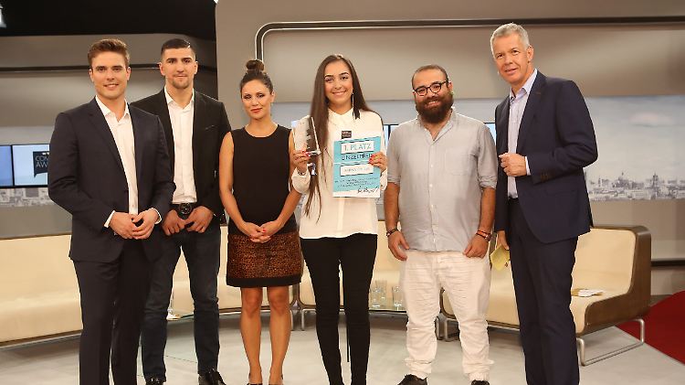 Die Gewinnerin in der Kategorie "Einzelpersonen", Amina Önder, mit Jurymitgliedern Constantin Schreiber, Marco Huck, Nazan Eckes, Firas Al-Shater und Peter Kloeppel (vlnr)
