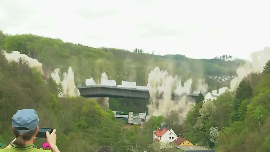 Nach minutiöser Vorbereitung bringen 150 Kilo Sprengstoff die 17.000 Tonnen schwere Rahmede-Talbrücke bei Lüdenscheid in Nordrhein-Westfalen zu Fall. Unter dem Jubel Tausender Schaulustiger gelingt die Aktion nach Plan.