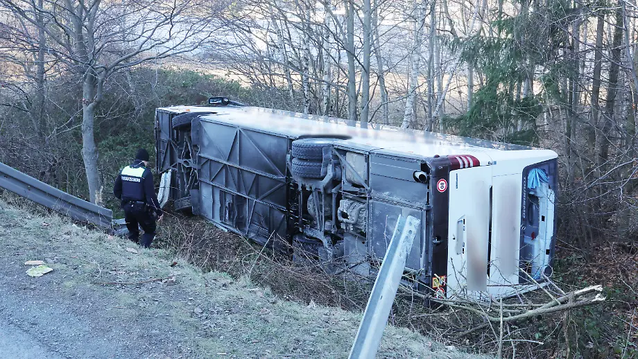 Unfall während AusflugReisebus mit Schülern kippt an Autobahnausfahrt in Thüringen um