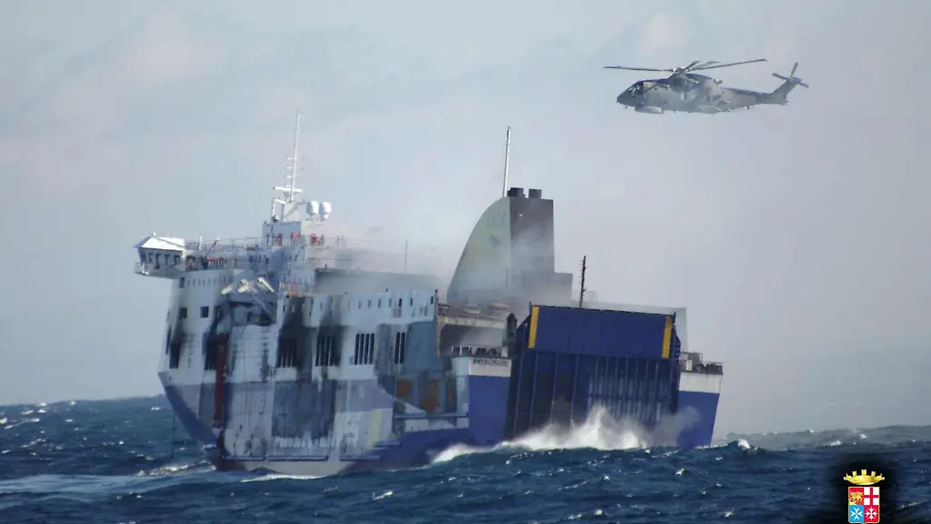 Schiffe und Hubschrauber suchten in rauer See rund um das ausgebrannte Wrack weiter nach Leichen. Die Fähre war am Montag komplett evakuiert worden. 427 Menschen wurden gerettet, darunter 56 Besatzungsmitglieder. Laut Passagierliste waren jedoch insgesamt 475 Menschen an Bord - damit wäre das Schicksal von fast 40 Passagieren ungewiss.