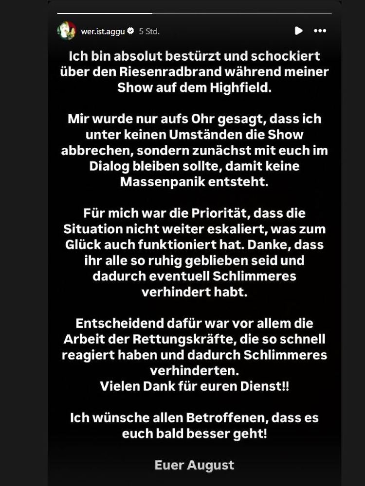 Als die ersten Flammen sichtbar wurden, stand gerade der Berliner Rapper Ski Aggu auf der Bühne. In seiner Instagram-Story schrieb er kurze Zeit später: "Ich bin absolut bestürzt und schockiert über den Riesenradbrand während meiner Show auf dem Highfield. Mir wurde nur aufs Ohr gesagt, dass ich unter keinen Umständen die Show abbrechen, sondern zunächst mit euch im Dialog bleiben sollte, damit keine Massenpanik entsteht."