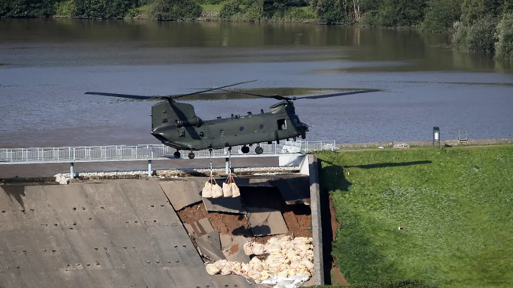 Nun kämpfen die Helfer vor Ort darum, dass die Wassermassen nicht über den gebrochenen Staudamm treten. Darum haben nach Angaben der BBC bereits Ingenieure Wasser aus dem Reservoir gepumpt. Im Kampf gegen den drohenden Dammbruch ist nun auch ein Hubschrauber der Royal Air Force zum Einsatz gekommen. Der Transport-Helikopter vom Typ "Chinook" werfe schwere Säcke mit einer Mischung aus Sand, Kies und Schotter ab, um umliegende Wasserläufe umzuleiten, berichteten örtliche Medien. Auf diese Weise solle Druck von der Staumauer des Reservoirs in der Nähe des bedrohten Ortes Whaley Bridge genommen werden. Die Feuerwehr veröffentlichte auf Twitter Videos des Einsatzes.