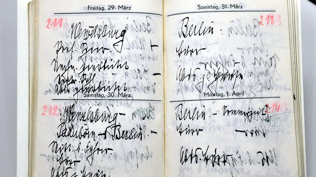"Wewelsburg Prof. Speer" steht unter dem 29. März 1940 im Taschenkalender von Heinrich Himmler. Und am nächsten Tag "Paderborn-Berlin. Mitt. b. Führer". Es sind die Tage 211 und 212 des Zweiten Weltkrieges, wie der "Reichsführer SS" mit rotem Stift vermerkt. Das schwarze Büchlein liegt aufgeschlagen in einer Vitrine der neuen Dauerausstellung der Erinnerungs- und Gedenkstätte Wewelsburg unweit von Paderborn. An der einstigen Versammlungsstätte der SS-Führung wird am 15. April nach jahrelanger Vorbereitung die Ausstellung "Ideologie und Terror der SS" eröffnet.