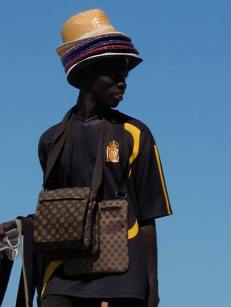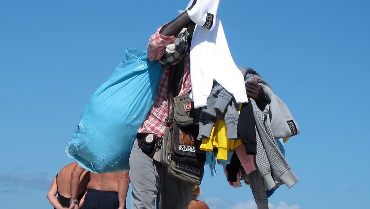Jeden Sommer setzt sich dieses kleine Heer von "Vucumprà" (sprich "Willste kaufen"), wie die Einheimischen sie nennen, in Bewegung. Die meisten kommen aus Nigeria oder dem Senegal. Sie sehen wie wandelnde Trödelläden aus, von Kopf bis Fuß bepackt. Was Hände, Arme und Schultern nicht mehr tragen können, ziehen sie selbst an. Zig Hüte stapeln sie wie bunte Türme auf ihren Köpfen. Meistens ist es Billigware: Strandspiele, Schwimmreifen, Brillen, Schmuck. Ab und zu sind aber auch Taschen, Polohemden und Sneakers bekannter Marken dabei, zum Großteil Imitate, jedoch nicht immer.