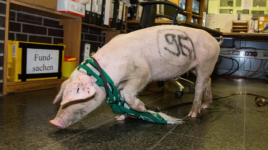 Mit einem Hannover-96-Schal um den Hals und schwarzer Farbe auf dem Körper ist das Tier in der Nacht durch Hannover geirrt. Ein Autofahrer hätte das Schwein um ein Haar angefahren, sagte ein Sprecher der Polizei. Der Mann alarmierte die Beamten, die das Tier einfingen und in ein Tierheim brachten.