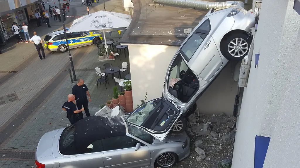 Großer Schock für einen Audi-Fahrer in Bottrop: Von oben kommt ein Mazda angeflogen. Eine 80-Jährige hatte kurz zuvor beim Rangieren den Vorwärts- mit dem Rückwärtsgang verwechselt und war mit ihrem Auto durch die Außenwand eines Parkhauses gebrochen. Mit der Front ihres Autos landete die Seniorin drei Meter tiefer auf dem Audi. Da die Hinterräder hängenblieben, stürzte sie glücklicherweise nicht vollständig ab.