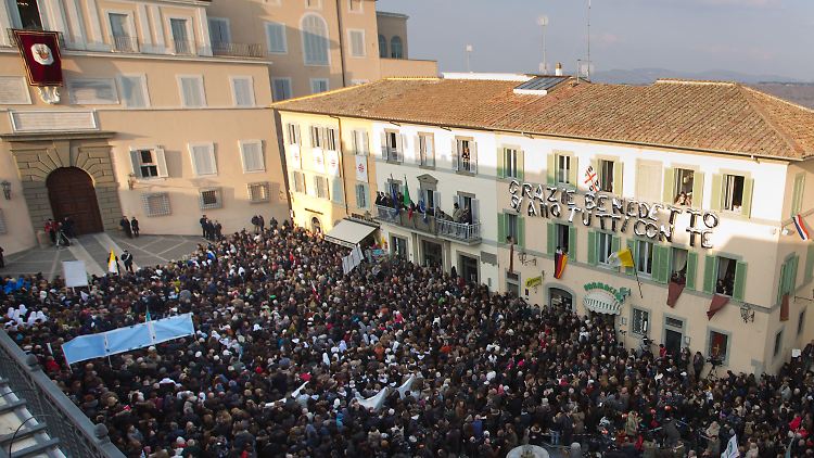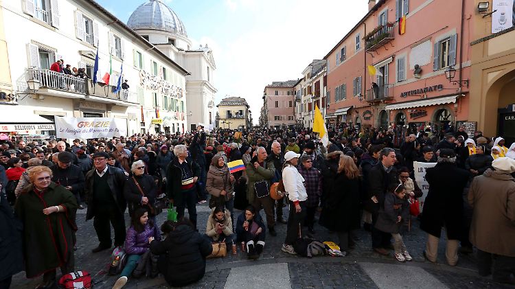 Noch ist er gar nicht hier, aber in Castel Gandolfo südlich von Rom ist die Aufregung schon groß. Vor der päpstlichen Sommerresidenz herrscht großer Andrang. Um 17 Uhr verabschiedet sich Benedikt aus Rom und fliegt mit dem Hubschrauber in die kleine Stadt am malerischen Lago Albano, wo er zunächst wohnen wird. In Castel Gandolfo ist am frühen Abend Benedikts letzter öffentlicher Akt. Von der Loggia des Palastes aus sendet er dann nochmal einen Gruß an die Gläubigen. Die Schließung des Portals der Residenz soll dann um 20 Uhr das symbolische Zeichen für das Ende des Pontifikats sein. Die Schweizer Garde stellt ihren Dienst ein, für die Sicherheit des ehemaligen Kirchenoberhauptes ist dann die Gendarmerie des Vatikans zuständig.