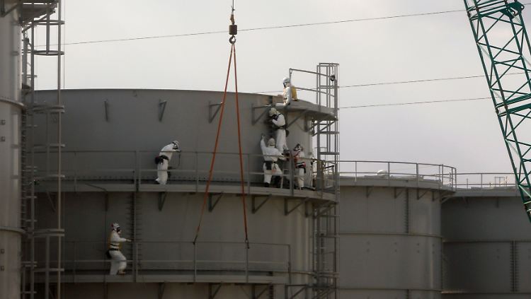 Das Archivbild zeigt Arbeiter an einem Wassertank in Fukushima. Derzeit häufen sich die Meldungen über Probleme des havarierten Atomkraftwerks.