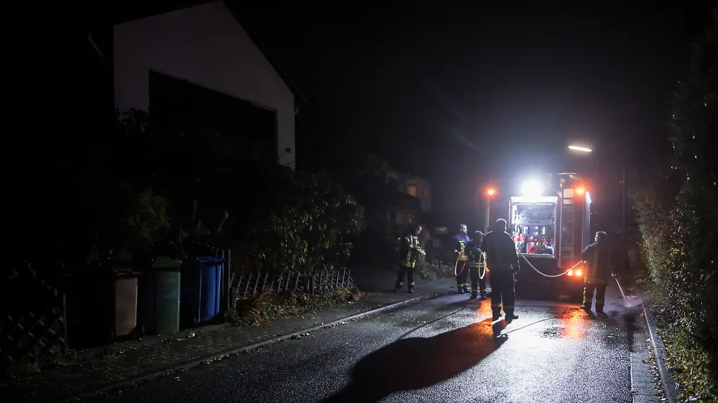Am Samstagabend werden die letzten Spuren der Bluttat in Wilnsdorf beseitigt: Einsatzkräfte der Feuerwehr säubern die Straße. Der Ort des Geschehens ist eine Wohnstraße abseits der Hauptstraße in dem kleinen Dorf bei Siegen.