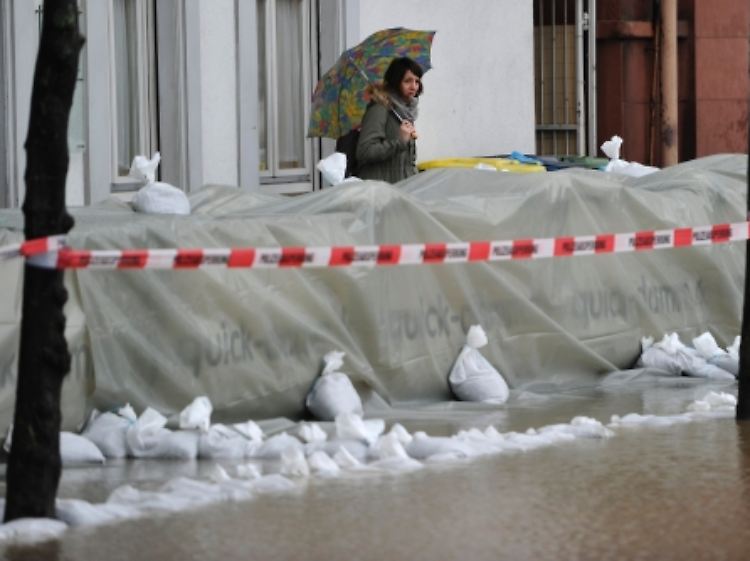 In Frankfurt umspülen die Fluten des Mains die schnell errichteten Hochwasserbarrieren vor dem Rathaus, dem "Römer", in der Innenstadt. "Das Wasser steht unmittelbar an den Mauern und staut sich dort bereits wenige Zentimeter", schildert ein Feuerwehrsprecher die instablie Lage. Der Pegelstand des Flusses lag bei 4,68 Metern. "Wie es weitergeht, können wir noch nicht abschätzen", fügte der Sprecher hinzu. Die Behörden erwarten das schwerste Hochwasser der vergangenen Jahre. 2003 hatte der Pegel die Marke 5,19 Meter erreicht.