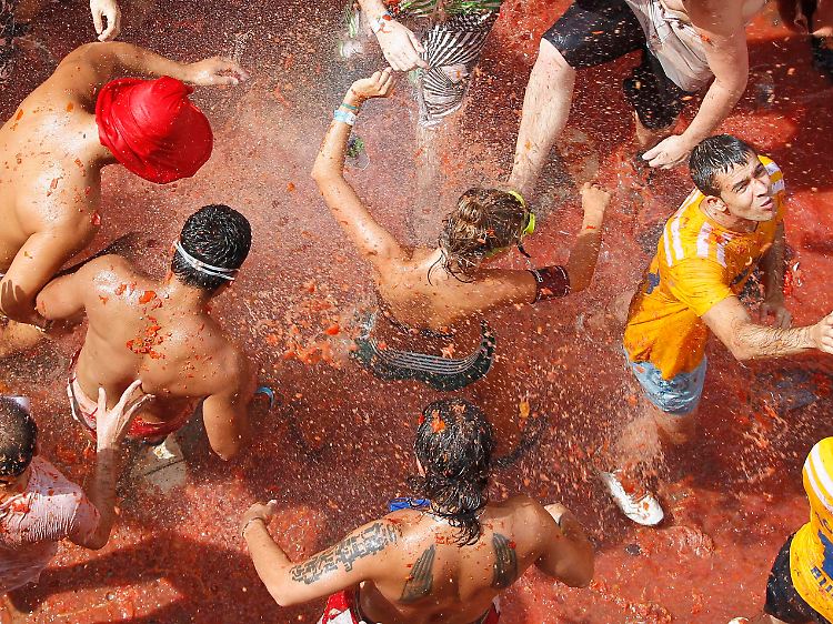 Zehntausende überwiegende junge Menschen aus aller Welt haben sich in der Ortschaft Buñol bei Valencia versammelt, um sich gegenseitig eine Stunde lang mit Tomaten zu bewerfen. Die Stadtverwaltung hatte dazu 120 Tonnen des Gemüses zur Verfügung gestellt.