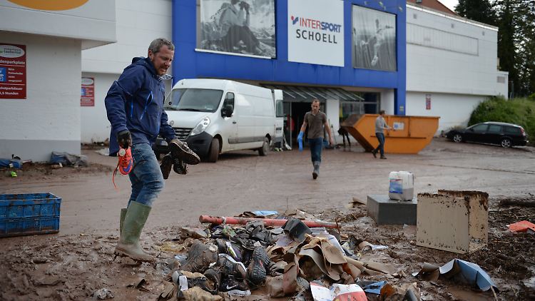Von den Wassermassen, die in die Unterführung flossen, wurde auch das Sportgeschäft von Irena Schoell geflutet. Das Wasser stand gut einen Meter hoch, wie Spuren an den Wänden zeigen. Helfer werfen nun Kleider, Schuhe, Schaufensterpuppen in einen Container im Hof. "Das ist ein Alptraum", sagt Schoell.