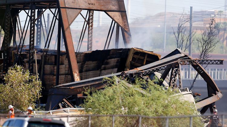 Im US-Bundesstaat Arizona ist bei einem schweren Unglück ein Güterzug auf einer Brücke entgleist und hat einen Großbrand ausgelöst. Bei dem Unfall über dem Tempe-Town-See in der Nähe der Metropole Phoenix wurde jedoch nach Angaben der Behörden niemand verletzt. Etwa hundert Einsatzkräfte der Feuerwehr und Polizei waren demnach am Unglücksort, die Brücke stürzte teilweise ein.