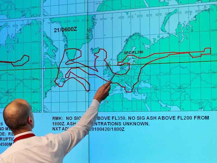 Im Krisenstab der Deutschen Flugsicherung: Die Ausdehnung der Aschewolke ist rot umrandet.