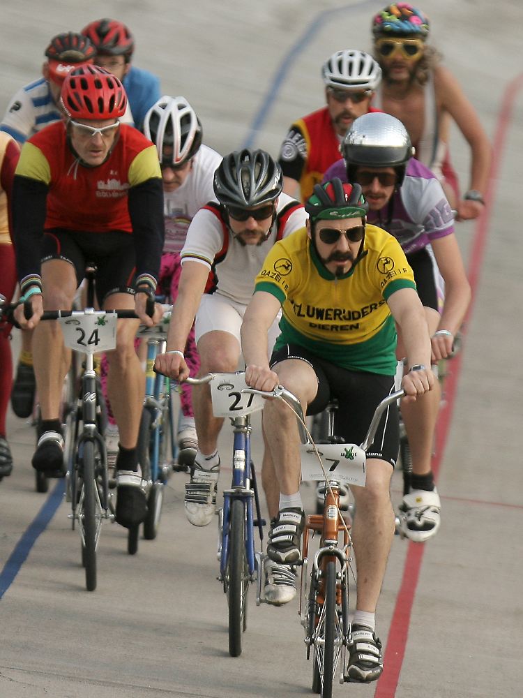 Der skurrile Wettbewerb soll an die goldenen Zeiten der Klappradkultur und des Oberlippenbarts in den 70er Ja hren erinnern. Zwingende Voraussetzung für die Teilnahme war neben einem mindestens 30 Jahre alten Klapprad ohne Gangschaltung ein echter "Porno-Balken" zwischen Mund und Nase. Die besten Verkleidung - vom Schottenrock bis zur holländischen Tracht - wurden vom Publikum mit extra Jubel bedacht.