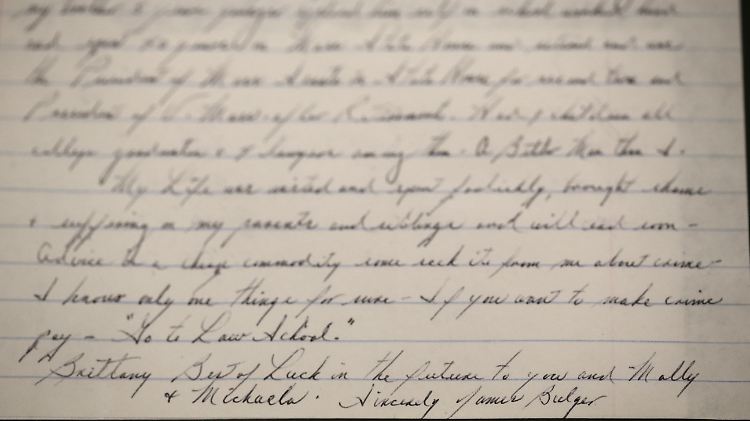 Unter anderem wollten sie von dem früheren Chef der berüchtigten "Winter Hill Gang" wissen, wie er selbst sein Vermächtnis beschreiben würde oder was er über seine Zeit in der kriminellen Szene in Boston zu sagen hätte. Wirklich gerechnet hatten die Jugendlichen nicht mit einer Antwort, doch dann schrieb ihnen Bulger zurück. Brittany Tainsh, eine der Schülerinnen, sagte, sie sei fassungslos gewesen, als sie den Brief unter einer Flut von College-Broschüren aus dem Briefkasten zog. "Das hatten wir überhaupt nicht erwartet."