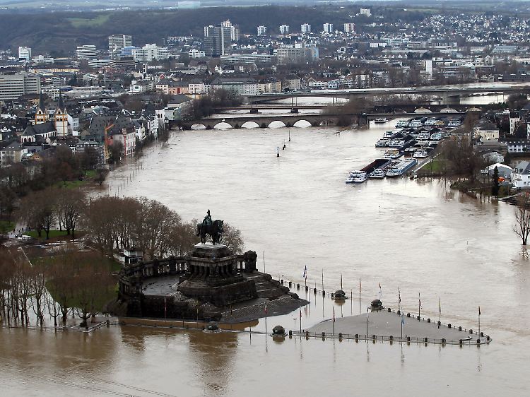 Die Hochwasserlage am Rhein bleibt angespannt, entwickelt sich aber weniger schlimm als befürchtet. In Koblenz, wo viele Menschen ihre Wohnung nur noch über Stege und Boote erreichen konnten, scheint der Scheitel mit 7,51 Metern bereits erreicht und damit deutlich niedriger auszufallen als befürchtet. "Ich gehe davon aus, dass das der Höchststand ist", sagte eine Sprecherin des Hochwassermeldezentrums für den Rhein in Mainz. Der Wasserstand am Pegel Koblenz stagniere seit mehreren Stunden, zuvor hatte sich der Anstieg am Vormittag deutlich verlangsamt. Sie führte den geringeren Höchststand auf ausgebliebene Niederschläge zurück. In der Vorwoche hatten Experten bis zu 8 Meter am Pegel Koblenz prognostiziert. Der höchste Wasserstand wurde dort 1993 mit 9,49 Meter gemessen. Normal sind 2,40 Meter.