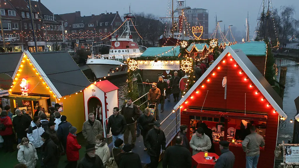 "Emder Engelkenmarkt": Der schwimmende Weihnachtsmarkt in Emden bietet eine ganz besondere Atmosphäre zwischen Museumsschiffen im Ratsdelfthafen und der Innenstadt. (Foto: picture-alliance/ dpa/dpaweb)
