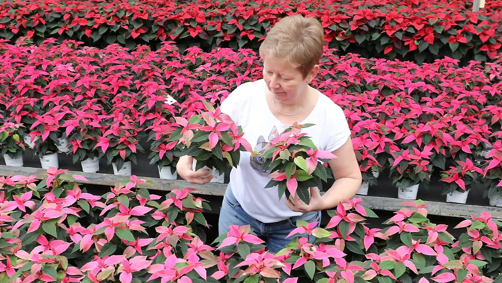 "Wir sind froh, wenn das kostendeckend ist", sagt der 44-Jährige. "Der Weihnachtsstern ist ein Produkt fürs vierte Quartal, um in der verkaufsschwachen Zeit die Gewächshäuser auszulasten." Und um die 75 Mitarbeiter der Gärtnerei weiter beschäftigen zu können. Einer von ihnen steht gerade mitten in dem roten Blumenmeer, das bei warmen 20 Grad gedeiht. Gekonnt dreht er die Töpfe in der Hand, zupft einzelne verwelkte Blätter ab und zieht anschließend eine schützende Folie über die Pflanzen.