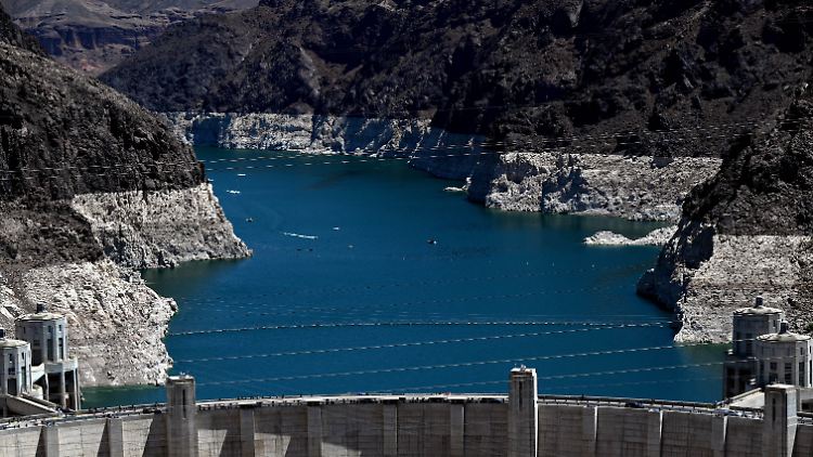 Am Hoover-Damm in Nevada staut sich so wenig Wasser wie noch nie. Der weiße "Rand" an den Felsen zeigt es deutlich.