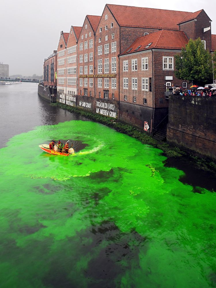Der argentinische Künstler Nicolás Uriburu hat die Weser in Bremen grün gefärbt. Mehrere hundert Schaulustige beobachteten die Performance anlässlich des 20-jährigen Bestehens des Museums Weserburg. Gekleidet in einen giftgrünen Overall kippte Uriburu das wasserlösliche Pulver Uranin eimerweise von einem Boot aus in den Fluss. Im Wasser entstanden knallgrüne Farbwolken, die die Strömung weiter in Richtung Nordsee trieb.