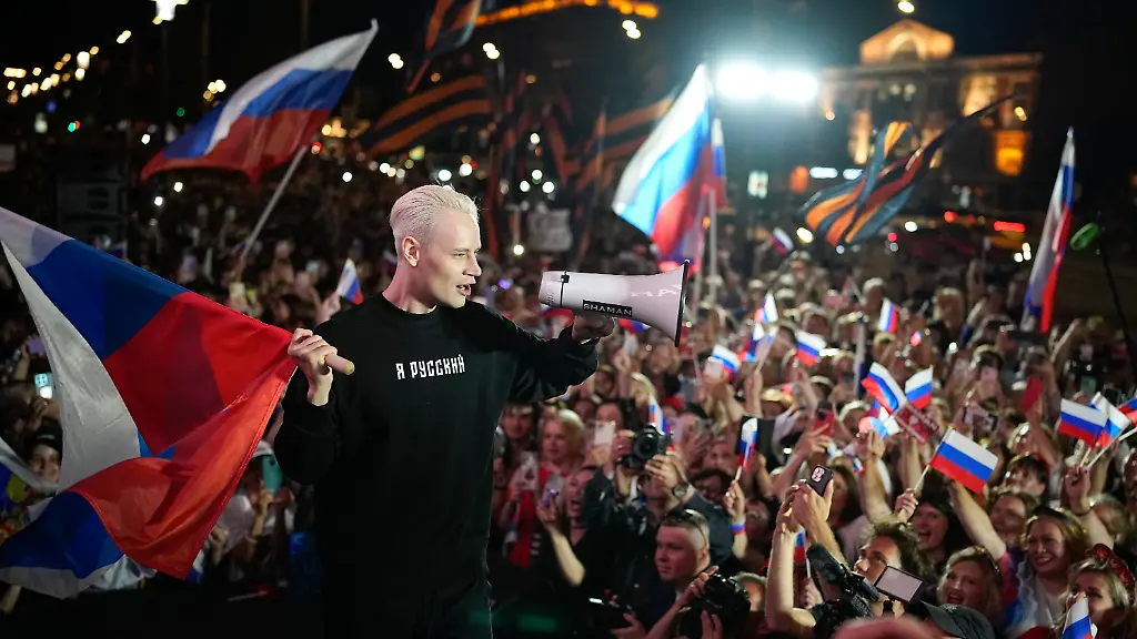 Die Menge johlt, als der weiß blondierte Sänger Jaroslaw Dronow - bekannt unter dem Pseudonym Shaman - seinen Hit "Ja Russki" ("Ich bin Russe") anstimmt. Auf der Bühne hinter Dronows Rücken wird eine riesengroße russische Fahne eingeblendet, er selbst trägt die Trikolore als Binde auf beiden Oberarmen. Unten im Publikum nahe der Stadt Sudak auf der von Russland seit 2014 annektierten ukrainischen Halbinsel Krim schwenken sie russische Flaggen und singen begeistert mit.
