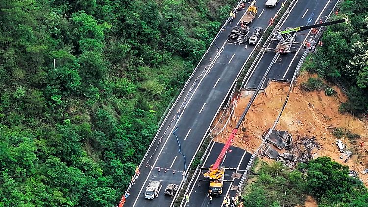 Nach Angaben der Verwaltung der Stadt Meizhou in der Provinz Guangdong stürzte der Straßenabschnitt am frühen Mittwochmorgen gegen 2 Uhr ein. In der Gegend hatte es in den vergangenen Tagen heftig geregnet. Augenzeugen berichteten örtlichen Medien, sie hätten ein lautes Geräusch gehört und ein metergroßes Loch an der Stelle klaffen gesehen, an der sie gerade vorbeigefahren seien. Auf Videos und Bildern waren Rauch und Feuer zu sehen, Leitplanken ragten in die Flammen. Auf einer Anschlussstelle zu der Schnellstraße standen verkohlte Fahrzeuge. Der Untergrund unter der Unglücksstelle schien ausgehöhlt zu sein.