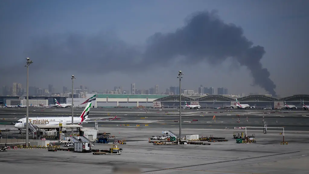 Eine-Rauchwolke-verursacht-durch-einen-iranischen-Angriff-ist-im-Hintergrund-zu-sehen-waehrend-Flugzeuge-der-Emirates-nach-der-Schliessung-des-Flughafens-auf-dem-Dubai-International-Airport-geparkt-sind