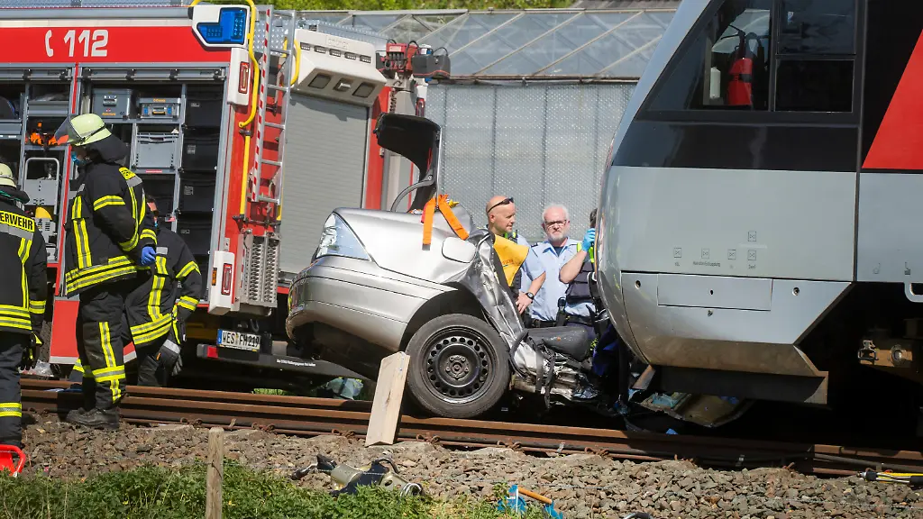 Nach der Kollision außerhalb der Ortschaft Dingden, die zur Stadt Hamminkeln gehört, wurde das Auto von dem Zug etwa 50 Meter mitgeschleift. Am Ende blieb das stark demolierte Wrack quer vor der Lok auf den Schienen liegen - vorne mit ausgelöstem Airbag. Die Einsatzkräfte waren wegen der Corona-Pandemie mit Schutzmasken im Einsatz. Die Feuerwehrleute trennten das Dach der Limousine ab, um an die Insassen heranzukommen, wie Wolbring sagte.