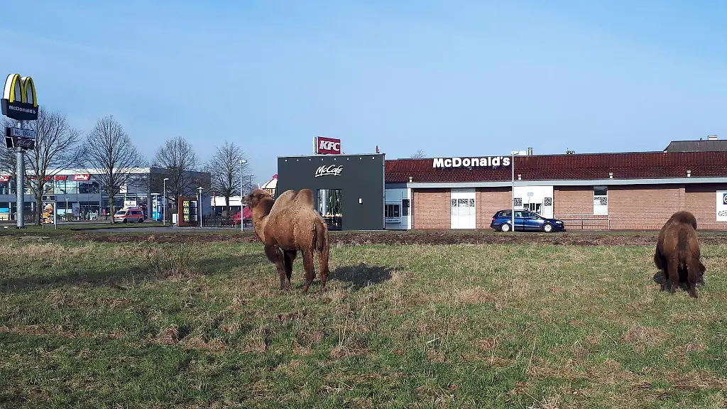 Zeit für eine Mittagspause - denken offenbar zwei Kamele eines Bremer Zirkus und stehlen sich davon. Die beiden Ausreißer verspüren wohl Lust auf einen Snack und traben zielsicher zu einem Schnellrestaurant. Ihr Ausflug bleibt nicht lange unbemerkt.