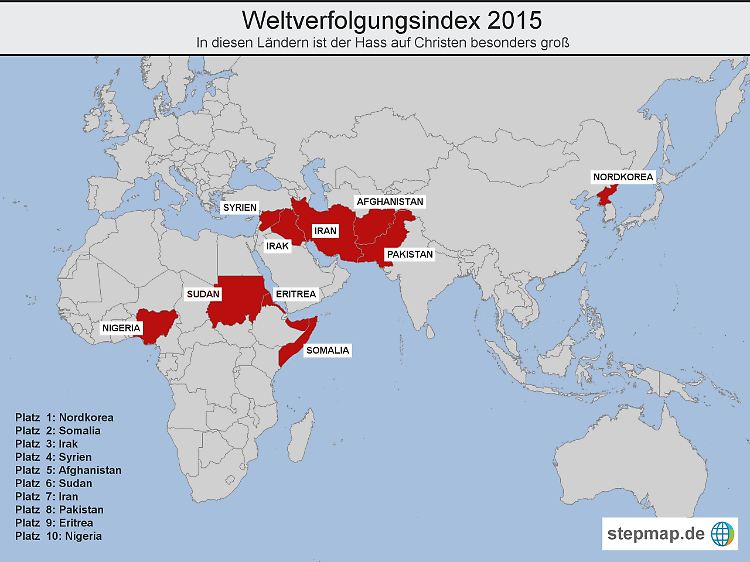 Nach Schätzungen von Open Doors sind weltweit rund 100 Millionen Christen wegen ihres Glaubens Repressalien ausgesetzt. In dem Ranking folgt Somalia auf dem zweiten Platz. Im Irak (3.) und in Syrien (4.) litten Christen besonders unter der Herrschaft der Terrormiliz "Islamischer Staat" (IS), heißt es. Aus der Ninive-Ebene und der Millionenstadt Mossul im Irak sei die christliche Gemeinschaft praktisch verschwunden. In Syrien seien von 1,8 Millionen Christen bereits 700.000 aus dem Land geflohen, viele weitere seien innerhalb des Landes auf der Flucht. Betroffen seien hier vor allem Christen aus den Gebieten, die der IS erobert hat.