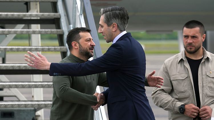Der irische Premierminister Taoiseach Simon Harris begrüßt den ukrainischen Präsident Wolodymyr Selenskyj am Flughafen Shannon.